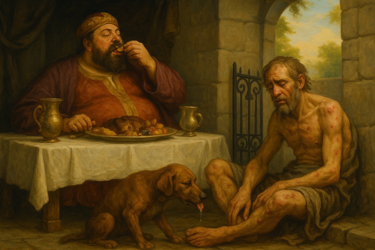 Ông nhà giàu, chủ nhân của ngôi biệt thự sang trọng “mặc toàn lụa là gấm vóc, ngày ngày yến tiệc linh đình.” Trong khi đó, ngay trước cổng nhà ông, có anh La-da-rô cùng khốn, ghẻ lở đầy mình, đưa mắt thèm thuồng nhìn ông ăn uống no say và khao khát được hưởng chút bánh vụn từ bàn ăn rớt xuống mà chẳng ai cho, chỉ có mấy con chó đến liếm láp ghẻ chốc cho anh.