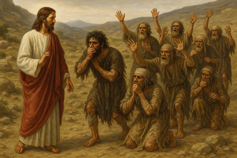 Khi Chúa Giê-su đi qua biên giới Samaria thì gặp 10 người phong cùi. Họ là những người mang số phận bi đát. Họ bị xã hội Do-thái thời bấy giờ xua ra khỏi gia đình, làng mạc; bị cách ly với tất cả mọi người. Những con người bất hạnh nầy tụ tập với nhau, sống trong các hang hốc ngoài đồi núi, áo quần tả tơi, đầu tóc bù xù, thân thể bốc mùi hôi hám. Họ bị luật buộc để đầu trần, đi đâu phải lấy tay che miệng và hô lên báo hiệu cho người qua lại biết mà lánh xa.